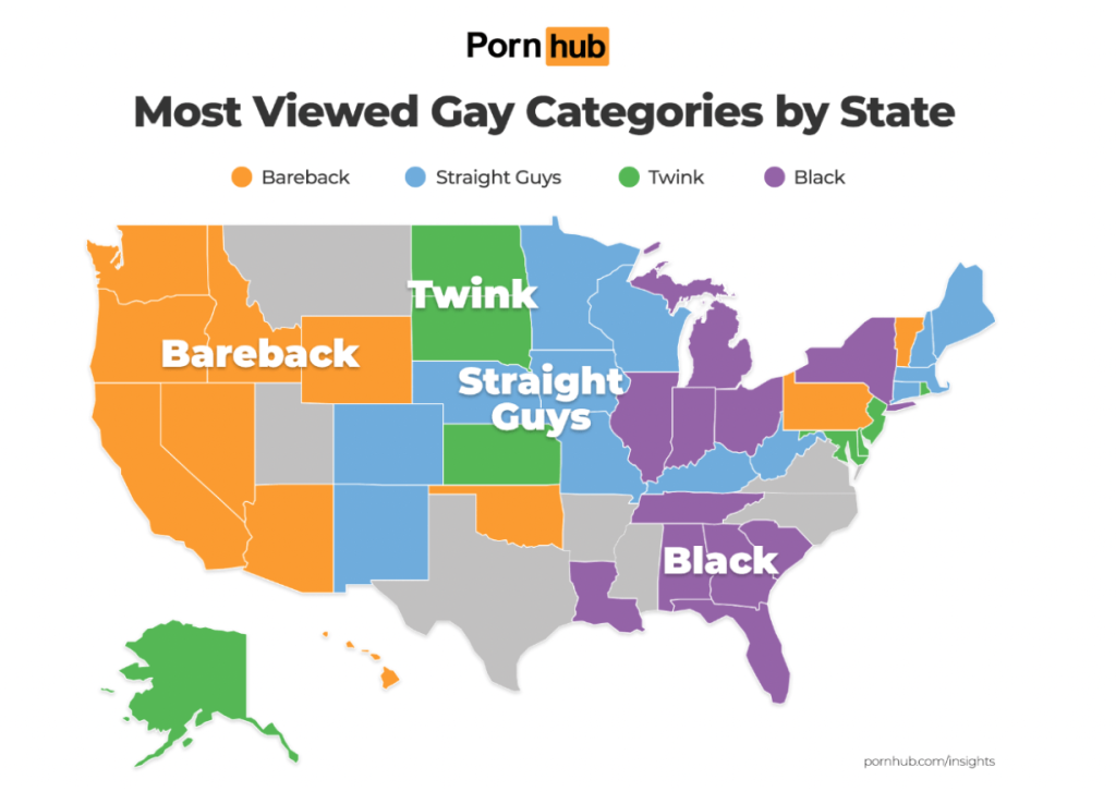 Straight guys and barebacking are the top gay porn categories in many U.S. states, according to PornHub’s research. Released during Pride Month in collaboration with pride.com, this data highlights the most-viewed categories and viewing habits based on global searches.