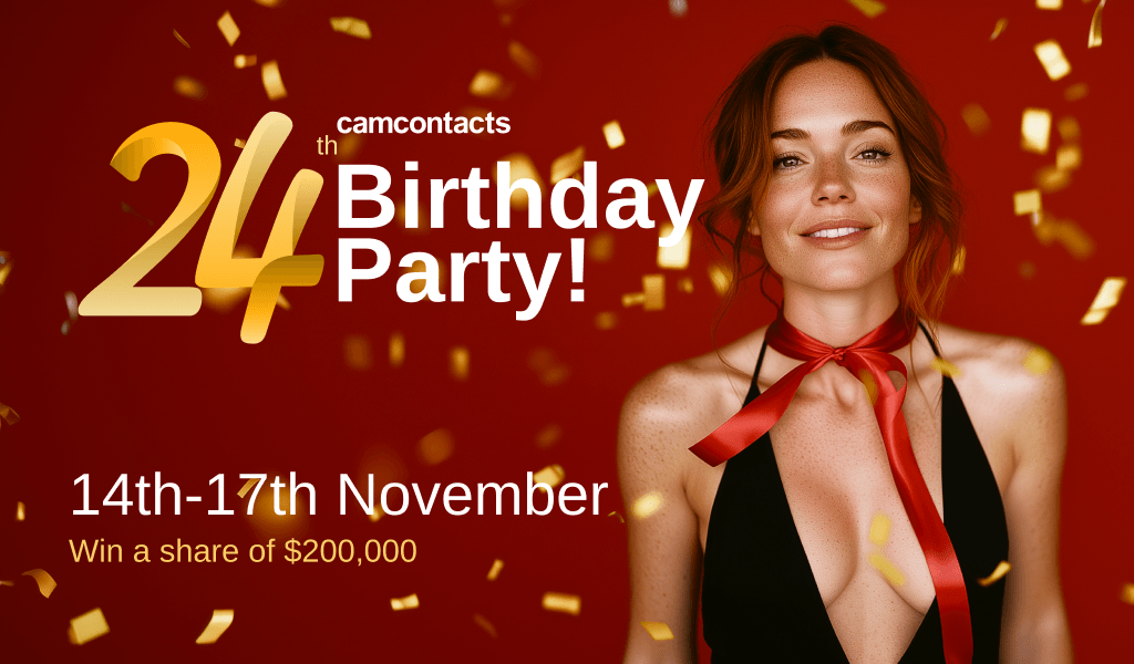 Join CamContacts in its 24th Birthday Event, with a four-day prize giveaway event starting on 14 November and ending on 17 November.  A prize pool of $200,000 that will be shared between Members and Chathosts who participate during our celebration event.  Everyone will have plenty of chances to win!