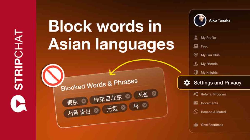 Stripchat introduces a new enhancement to its “Blocked Words and Phrases” feature, enabling models to block words using Asian characters, including Chinese, Korean, and Japanese. This expanded functionality provides better chat control with: