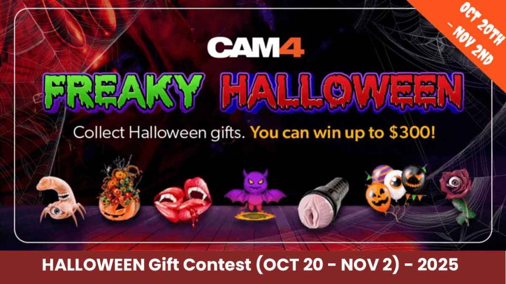 CAM4 announces its annual HALLOWEEN Gift Contest from Oct 20 (12:00 a.m. ET) to Nov 2 (11:59 p.m. ET). Broadcasters who earn the most from “Halloween” gifting categories win cash: $300, $150, $100, $80, $50, $30, and $20 for 7th–10th.